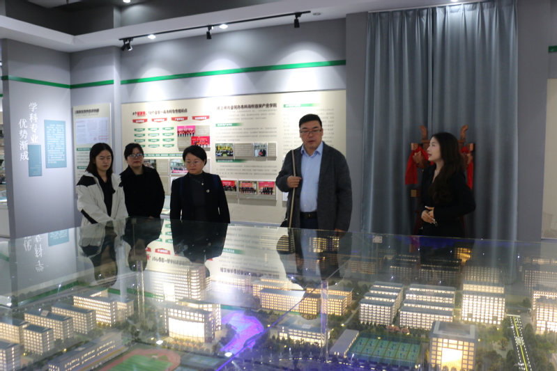 会前,在应用技术学院副院长熊晓亮的陪同下,江懿秘书长一行参观了我校校史馆,了解了学校的建校历程和发展状况,以及二十余年来在学科专业、人才培养、科研服务等方面取得的荣誉和成就,对学校深厚的历史底蕴与完善的设施给予高度赞扬,表示学校的文化成果内涵丰富,办学特色突出鲜明。