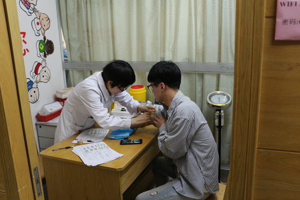 到达血液中心后,大家先在医护人员的安排下用餐,随后跟随着医护人员进行献血前的身体检查。有些新加入的志愿者是首次参加献血活动,在学长学姐的鼓励和医护人员的陪同下,他们很快克服紧张情绪,有序的进行检查。志愿者们在等待结果同时还向医护人员咨询献血知识,准备给校内的其他同学进行普及。