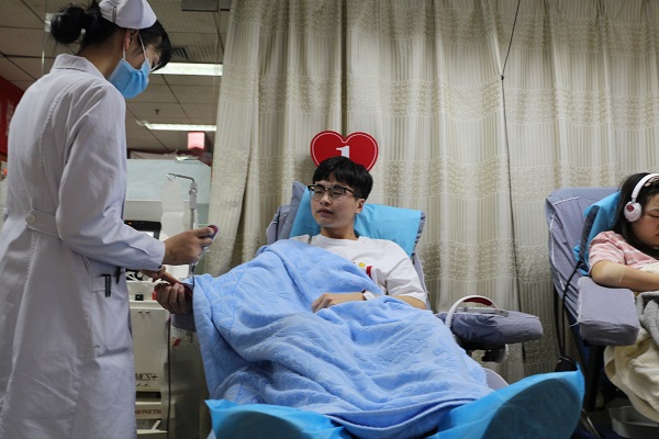 成分献血的时间一般在1个小时左右。体检合格的同学在医护人员的带领下,有序的坐在各自献血机前,医护人员将每名志愿者的体检状况讲述给志愿者,以方便各志愿者更加了解自己身体的状况。在献血期间,医护人员帮助志愿者们盖好毯子,并及时给有需要的献血志愿者提供热水等贴心服务。