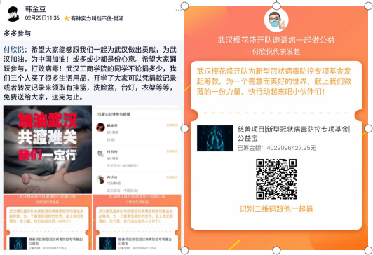 正是看到了这一点,几位同学商量过后,想成立了一支募捐队伍。谈及队伍的名字“武汉樱花盛开队”,满满都是他们对武汉的祝福——希望樱花盛开之时,疫情可以过去。“当时在一个视频当中看见武汉空城的景象,医院的物资又紧张,心里很难过,又不能做什么,捐了款后,又拉着朋友一起来捐”,付欣悦同学于是说:“但是觉得仅仅靠身边的朋友来募捐可能比较少。段金梅和汪聪同学主要负责宣传动员身边的朋友来帮忙转发和捐款。我和室友韩金豆以前勤工俭学卖过日用品,就想着可不可以用奖励的方式吸引大家捐款。BB贝博艾弗森官方网站的同学可以凭捐款截图开学来找我们领日用品。金豆特别善良,当我问可以把咱们进的货捐出去吗,金豆一点没犹豫。”