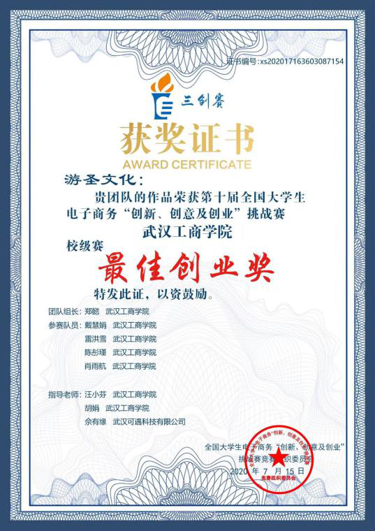 “成功者和其他人最大的区别就是他们真正动手去做了。”这是郑懿同学的座右铭。他的父亲是名退伍军人,并希望他能够子承父业去当兵,郑懿同学心里创业的点子总是在不断发酵,他从未歇过前进的步伐,他和他的团队创建了专注于文化创意领域的博览交易平台——云礼文创,致力于将优质IP创造出衍生价值。并以此获得第十届全国大学生电子商务“创新、创意及创业”挑战赛最佳创业奖、特等奖。并且郑懿学长的团队正在不断发展。2019年10月21日“游圣文化”成为“武汉文化创意产业协会”会员单位;10月“云礼文创”正式立顶,筹资6万元;11月20日“游圣文化”在上海办事处成立;在今年6月“云礼文创”被纳入大学生创新创业训练计划省级重点项目,且“云礼文创”官方企业淘宝店铺与拼多多店铺正式上线。一潭死水永远也不会泛起美丽的浪花,只有海纳百川才能惊涛骇浪。相信一定会有更多新鲜的血液不断涌入他们,和他们共同开创一个属于自己的天地。