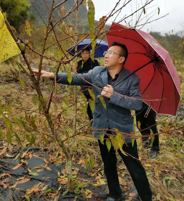 11月7日上午,邱微鹏、刘模发在九畹溪镇人大副主席谢永彪、学校驻村工作队队长王强及穿心店村党总支书记李刚的陪同下,冒雨实地考察村里的小水果种植基地及大棚建设基地,围绕小水果的选种、栽种、病虫害防治等方面为当地农户提出改进意见和建议,并提供技术指导。