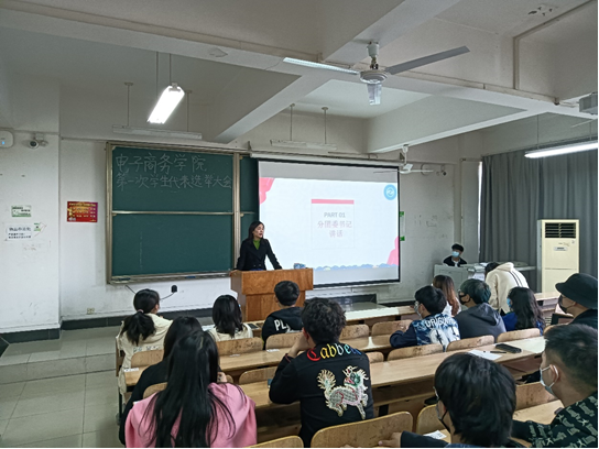 会议第一项,由分团委书记舒娟对此次会议进行了介绍以及选举要求。将在23名优秀学生成员中选出1名优秀学生代表,代表电商学院参加校级学生代表大会。作为学生代表,应积极向班级传达召开学生代表大会这一活动信息,并接受同学们的反馈意见。在舒娟书记的详细介绍下,同学们对会议有了了解,介绍结束后会场响起了热烈的掌声。