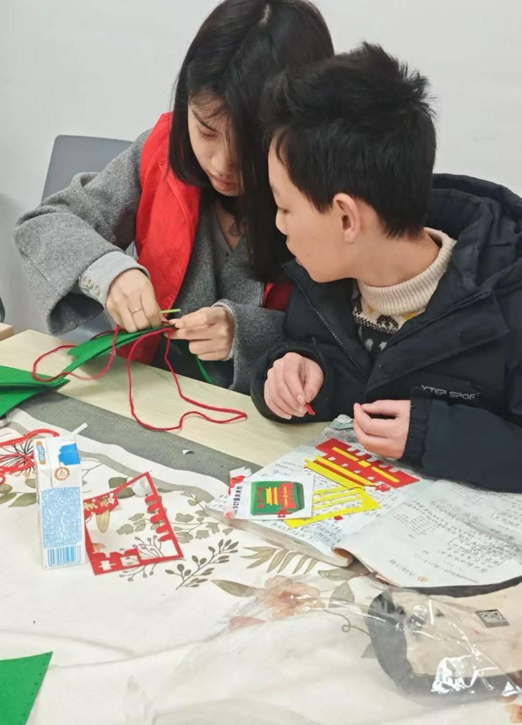 图为志愿者在和小朋友一起做手工 摄影:李雪