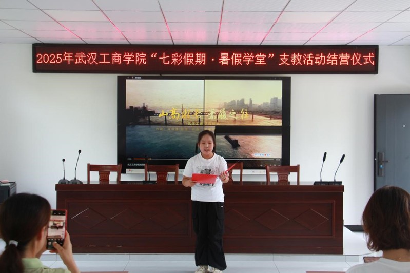 随后,托管班学生代表徐婉婷同学登台发言。小朋友以真挚的情感回顾了在“爱心托管班”度过的充实而愉快的时光,表达了对志愿者老师们传授知识、组织活动的感激之情,分享了在课程学习与互动中收获的成长与友谊,言语间流露出对这段经历的珍视与对未来的美好憧憬。接着,志愿者代表王宏伟发表了感言。他系统总结了本次支教活动的整体情况与个人体会,表示深入基层的实践经历使团队成员深刻认识到教育对于乡村儿童发展的重要性,锻炼了自身的社会实践能力和教学组织能力,强化了青年学子服务社会、奉献基层的责任担当。这段经历将成为志愿者们大学生涯中一段珍贵的精神财富。
