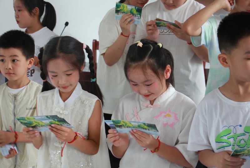 仪式最后,每位志愿者都提前为小朋友们亲笔书写了饱含祝福、鼓励与殷切期望的明信片寄语。在庄重而温馨的氛围中,志愿者们郑重地将这些承载着深情厚谊的明信片一一赠予小朋友。小朋友们神情专注地接收这份特殊的礼物,仔细阅读文字,现场洋溢着感动与惜别之情。这一纸寄语,不仅凝结了志愿者对孩子们健康成长的真诚祝福,也象征着志愿者们与谢店村儿童之间深厚情谊的延续。