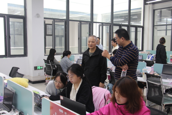 图为领导老师走访实习生工作场地 摄影:李美霖