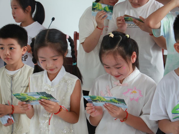仪式最后,每位志愿者都提前为小朋友们亲笔书写了饱含祝福、鼓励与殷切期望的明信片寄语。在庄重而温馨的氛围中,志愿者们郑重地将这些承载着深情厚谊的明信片一一赠予小朋友。小朋友们神情专注地接收这份特殊的礼物,仔细阅读文字,现场洋溢着感动与惜别之情。这一纸寄语,不仅凝结了志愿者对孩子们健康成长的真诚祝福,也象征着志愿者们与谢店村儿童之间深厚情谊的延续。