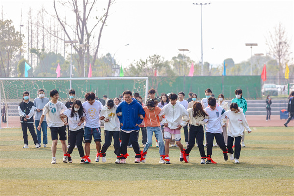 “多人多足十分考验团队的默契和耐心,赛前我们基本上每天晚上都有训练,从最开始地步调节奏混乱、不断摔倒,到后来大家逐渐统一步伐、稳中求快、相互协调,直至迈向了胜利的终点。最终能够夺得第一名,大家都很开心,也非常有集体成就感,每天晚上的刻苦训练都是值得的。”2021级软件工程专业1、2、3班的学生们以10秒28分的成绩获得学生混合组多人多足第一名后激动地说道。