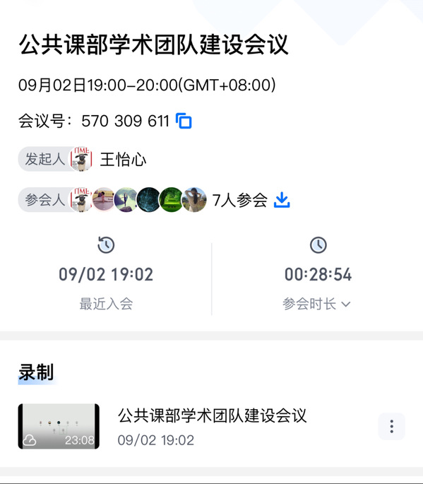 新闻中心讯(记者 王怡心)2024年9月2日晚上19点,公共课部召开了学术团队交流会议。本次会议以线上形式召开,参会成员有课部主任吴珊、各学术团队负责人刘文斌、李高升、润波、黄益、李昭昭及教学秘书王怡心。
