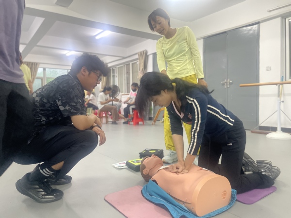 “按压位置偏上了!要顺着下巴往下找准位置。”袁国华导师蹲在地上,握住老师的手,耐心地调整按压位置。
