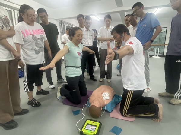 在理论讲解环节,两位导师反复提及的“急救现场五句话”,成为了教师们记录的重点:一查环境保安全,首先要确认现场不存在触电、坠物等二次伤害风险,在暴雨天尤其要注意漏电问题;二拍双肩喊同志,轻轻拍打患者双肩,凑近耳边大声呼唤,以此判断患者是否有意识;三呼救援取设备,立即大声呼救,请周围的人拨打120,并迅速取来最近的AED设备;四压五救不中断,双手交叠,双臂保持垂直,以每分钟100 - 120次的频率按压胸骨中下段,按压深度为5 - 6厘米,且持续按压不能中断;五是AED到快除颤,待AED设备到达后,按照语音提示贴好电极片,在机器分析患者情况时,所有人都要远离患者,确认需要除颤后,继续进行心肺复苏操作。“这五句话就是‘救命流程的导航仪’,哪怕紧张到大脑一片空白,只要按照口诀一步一步来,就能抓住黄金救援时间!”彭玉导师一边说着,一边现场进行示范。