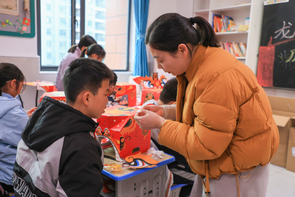 手工制作环节则成为孩子们亲近非遗、动手创造的乐园。在老师和大学生们手把手的指导下,孩子们认真裁剪、拼贴、装饰,将平面材料变成立体灵动的狮头作品。“看,我做的醒狮头成功了!”学生孔祥麟高举自己的作品,眼中满是自豪。指尖流转之间,非遗不再是书本上的概念,而成为了可触摸、可创造的文化印记。