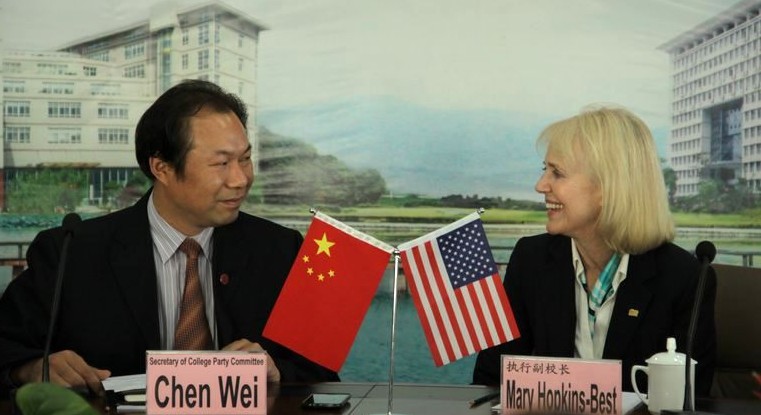(学通社 刘特)2012年10月23日下午,美国威斯康辛大学斯托特校区执行副校长Mary Hopkins-Best、国际办公室主任Hong Rost、管理学院副校长Kathrine Lui一行5人到访我校,我校党委书记陈伟,副校长陶梅生、刘腾红,国际教育学院副院长马冬玲等重要领导在第一会议室热情接待了来宾,双方进行了有关进一步合作的洽谈。会上双方就办学理念、经验成果交换了意见,并将签署“备忘录”,即除“2+2双学位”协议之外,预备从师资、教研等方面展开全方位深度合作。