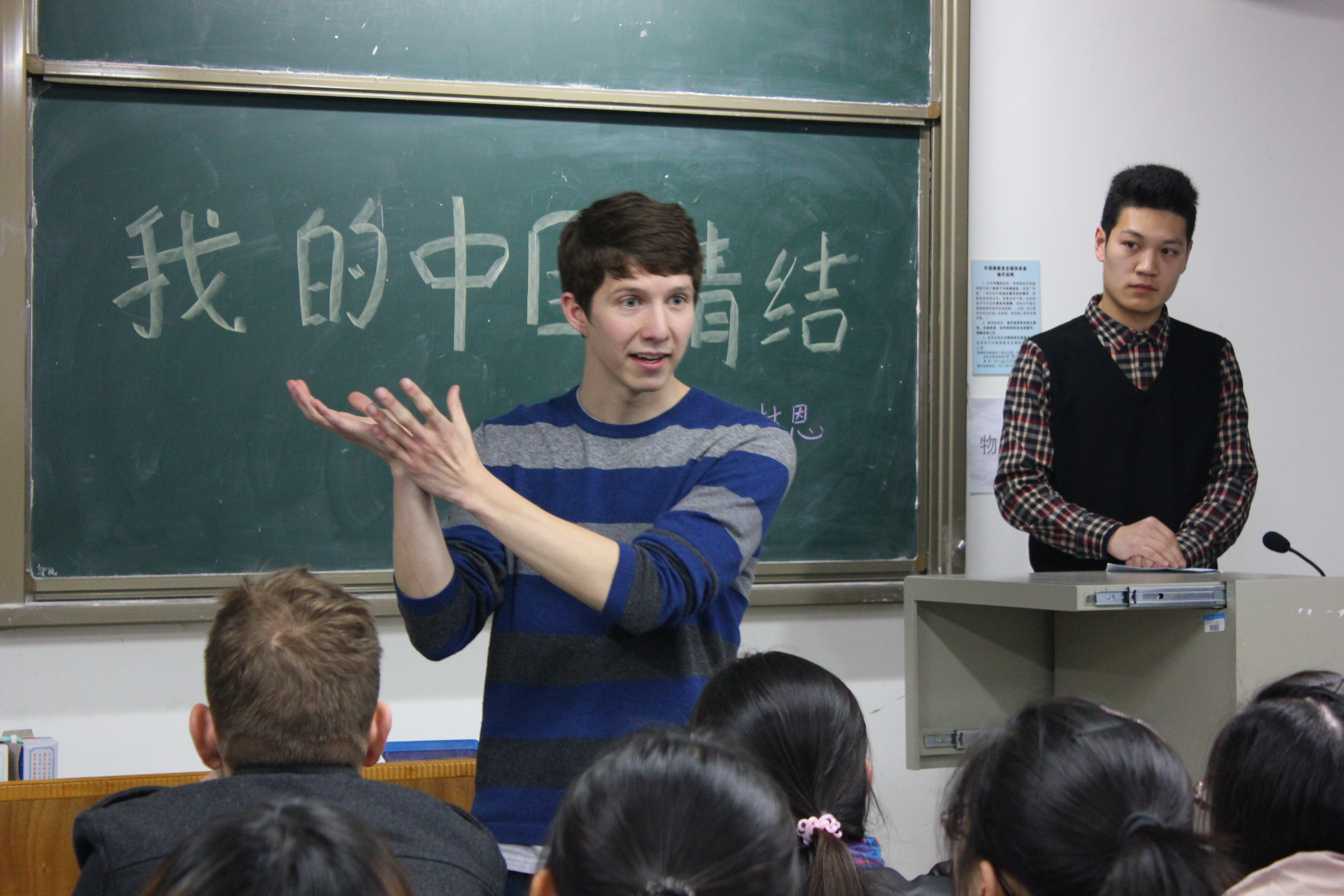 新闻中心讯(记者 刘特)3月26日晚,我校国际合作交流处在外语楼114室举办了三月国际活动月系列活动的最后一场外教讲座,为三月国际活动月画上了圆满的句号。美籍教师Bryan Herbert讲述了他眼里中美文化的对比和对中国的喜爱。 刚到7点,Bryan老师帅气地走上讲台,用有些蹩脚的汉语跟大家问好:"你们好,我是Bryan,中文名字叫林恩,欢迎你们参加我的讲座。"不太标准的口音逗笑了在场的同学。Bryan表示一年半的中文学习还不能让他灵活的使用,汉语对他来说太难了,说着还摆了个鬼脸以示无奈,在场学生忍不住捂着嘴偷笑,现场气氛十分活跃。 "这是我叔叔和婶婶的婚礼。"Bryan在大屏幕上展示自己在家乡的照片,其中有他出席叔叔婚礼的照片。他表示在美国只参加过两次婚礼,戏称在中国则是"Once a month"。Bryan还晒出自己大学期间四处旅游的照片,他说:"我们应该合理安排自己的时间,学习玩耍两不误。" 作为清华大学的交换生,Bryan第一次来到中国,便爱上了这个国家。在中国,他继续着自己的旅行,去峨眉山看乐山大佛、去上海欣赏"东方之珠"、去山东威海度假…… 提问环节中,有一位老师表示想知道Bryan对中国的印象和对在座学生的建议,Bryan回答道:"中国是一 个了不起的国家,我很敬佩中国的文化。对这些学生,我希望他们能够不停追寻自己的梦想,想做就做,不管别人说什么,选择权在自己手里,就像我老师告诉我的--‘no explain, just go’。" 来自经济与商务外语学院的刘启祥同学说:"Bryan老师说的令我觉得受益匪浅。国际合作交流处的这些活动挺有意义的,让我有机会学习和了解更多东西,我会继续关注接下来的活动。"国际合作交流处劳老师表示,4月还会有威斯康辛大学来访和意大利教授的讲座。 ![]() |