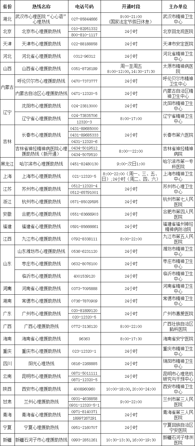 3、服务内容仅限本次肺炎疫情心理支持。如你感觉情况紧急或处于心理危机状态,可拨打武汉市精神卫生中心危机干预热线027-85844666或省委教育工委、省教育厅心理支持热线4007-027-520,接受心理危机干预的服务。