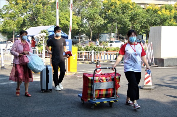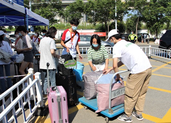 随着新同学们的陆续到来,学生志愿者们热情地接过他们手中的行李,认真测温、查验录取通知书及核酸结果。一声声贴心的问候、一句句热心的交谈都饱含学长学姐们对新生满满的关怀。