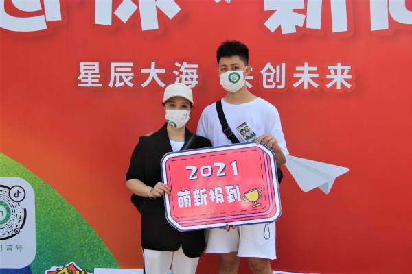 图为新生开心地留下大学第一张照片 摄影:尹芊