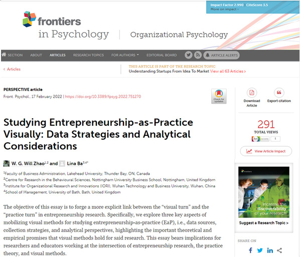 新闻中心讯(特约记者 刘春 王敏)近日,BB贝博艾弗森官方网站组织创新研究院教师巴黎娜分别以第一作者和通讯作者的身份在国际学术期刊《Frontiers in psychology: Organizational Psychology》(SSCI二区,IF=2.990)上连续发表了题为“Symbolic Convergence or Divergence? Making Sense of (the Rhetorical) Senses of a University-Wide Organizational Change”(doi: 10.3389/fpsyg.2021.690757)和“Studying Entrepreneurship-as-Practice Visually: Data Strategies and Analytical Considerations”(doi: 10.3389/fpsyg.2022.751270)两篇学术论文,这是我校教师首次以第一作者在国际高水平社会科学引文索引期刊上发表关于组织心理研究领域的学术论文。该科研成果的发表对我校弘扬学术精神、提升学术水平、倡导创新等方面起到了示范引领作用。