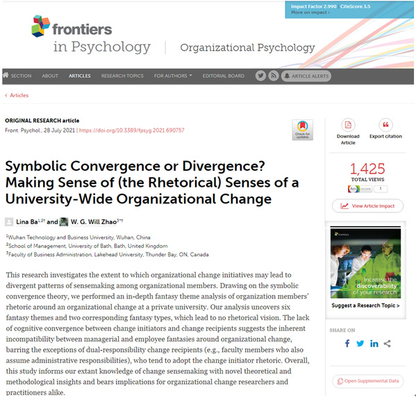 “Symbolic Convergence or Divergence? Making Sense of (the Rhetorical) Senses of a University-Wide Organizational Change”基于符号趋同理论,调查了组织变革举措在可能会导致组织成员之间感官制造的不同模式,并对一所私立高校进行了深入的幻想主题分析,分析揭示了六个幻想主题和两种相应的幻想类型,表明围绕组织变革的管理和员工幻想之间存在固有的不相容性。研究为现有的变革感知知识提供了新的理论和方法见解,并对组织变革研究者和实践者都有启示。
