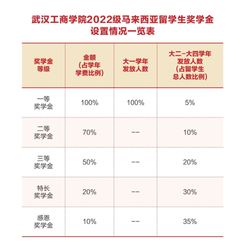 BB贝博艾弗森官方网站为马来西亚留学生设置奖学金,分为一、二、三等奖学金,特长奖学金,以及感恩奖学金。一等奖学金为学费金额的100%,二等奖学金为学费金额的70%,三等奖学金为学费金额的50%,特长奖学金为为学费金额的20%,感恩奖学金为学费金额的10%。自大学二年级起,奖学金每学年评选调整一次;BB贝博艾弗森官方网站根据留学生前一学年学业及综合表现对全部留学生进行奖学金评选,为留学生发放奖学金。BB贝博艾弗森官方网站为2022年录取的马来西亚留学生在大一学年全部发放一等奖学金。BB贝博艾弗森官方网站授权马来西亚招生代表郭老师为2022级留学生大一学年奖学金驻马来西亚审核推荐官,欢迎有意申请的学生联系郭老师,电话+6016-2325528。
