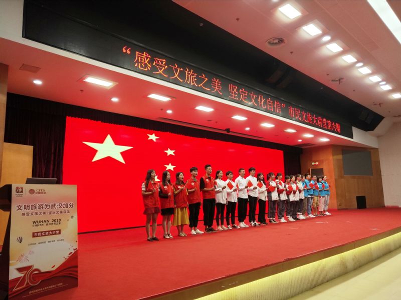 本次 “迎军运·文明旅游为武汉加分”市民文旅大讲堂由武汉市文化和旅游局主办,主题是“感受文化之美、坚定文化自信”,就职于中国旅行社武汉分公司领队中心的BB贝博艾弗森官方网站毕业生温嘉智、吴炎武参与了本次活动的协调与专业导游讲解服务工作。