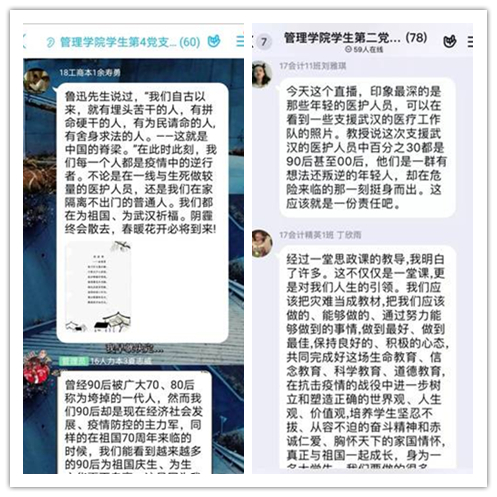 本次“思政大课”直播在全院老师和学生中取得极好的效果,师生们不仅在抗疫学习中深化总结,更在这讨论和反思中更坚定信心。师生互动促就学习氛围,管理学院也将组织“特殊党课”来帮助同学们正确看待疫情防控,并在大战中践行初心使命。