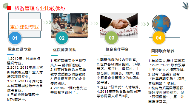 旅游管理专业起建于2004年,经发展成为“校级重点专业(2010年)”,“湖北省高校战略支柱产业人才培养计划专业(2012年)”、“湖北省高校综合改革试点专业(2013年)”,现成为一个拥有300余名在校生、16名专职教师,5名知名企业导师的师生团队,其中教师团队里教授、副教授、博士的高职称、高学历教师占70%以上;已形成“优质双师团队+校内外优质实训、实习平台”保障,“校企合作+国际联合”精准培育新业态旅游业市场需求的高素质应用型管理人才的办学专业特色和优势。