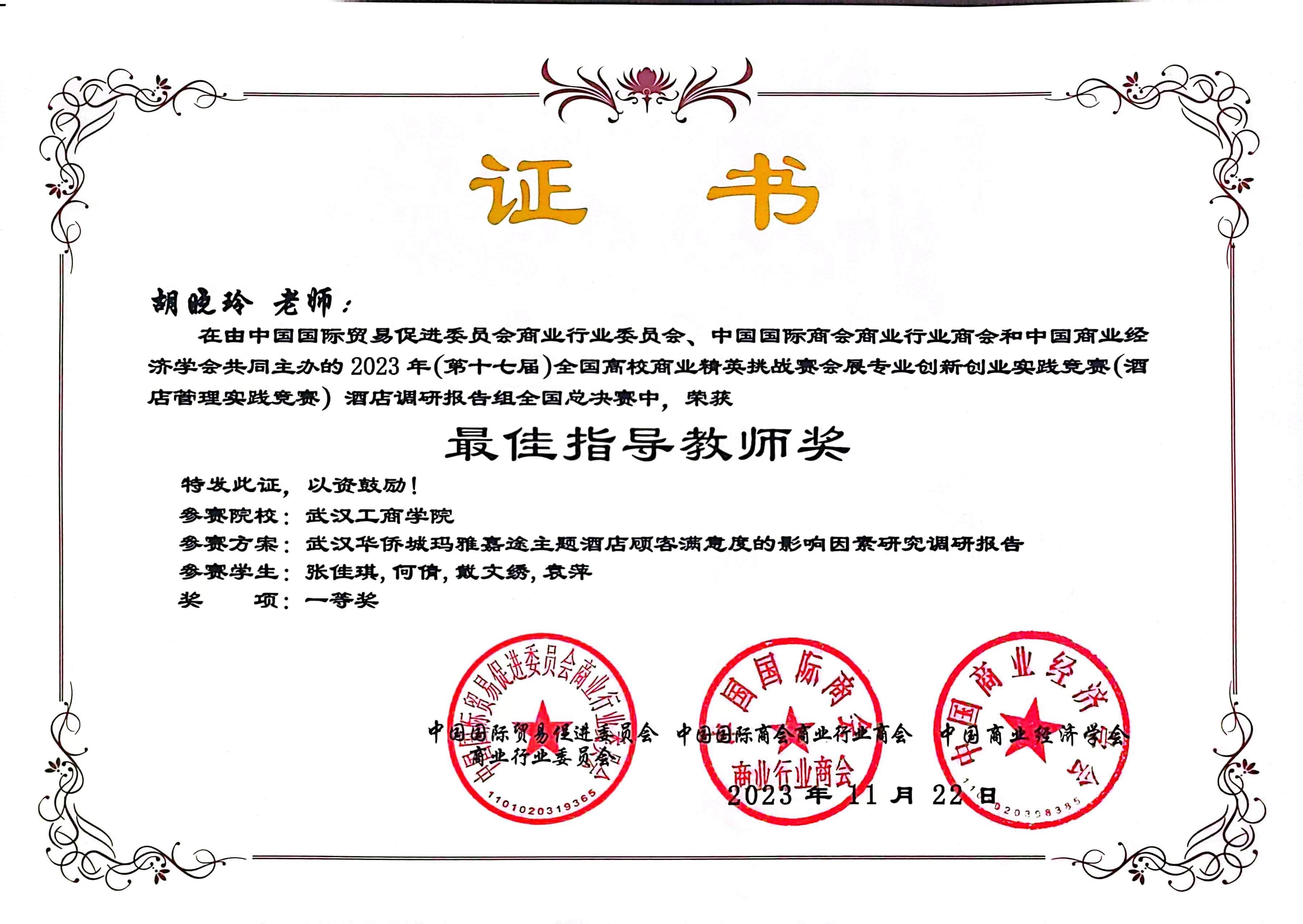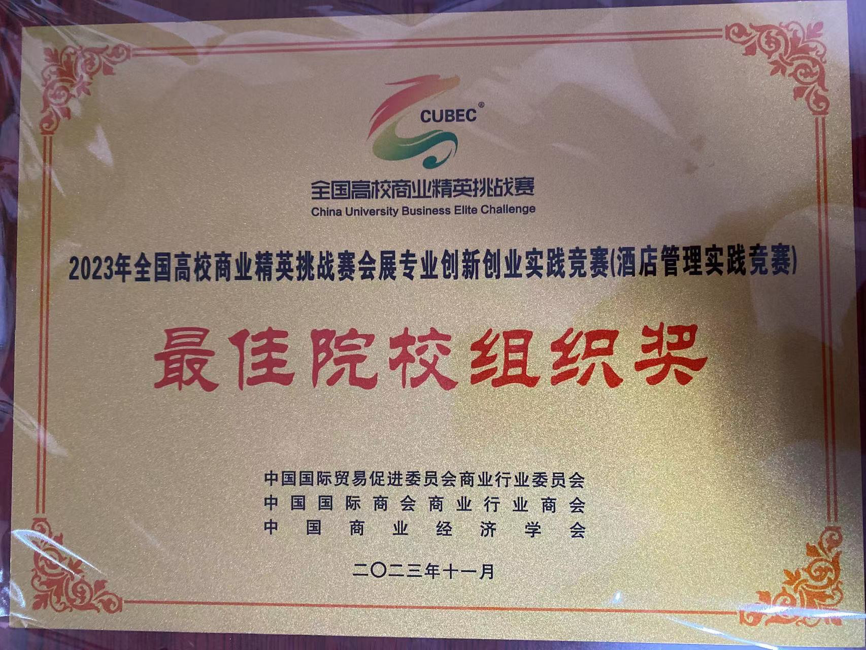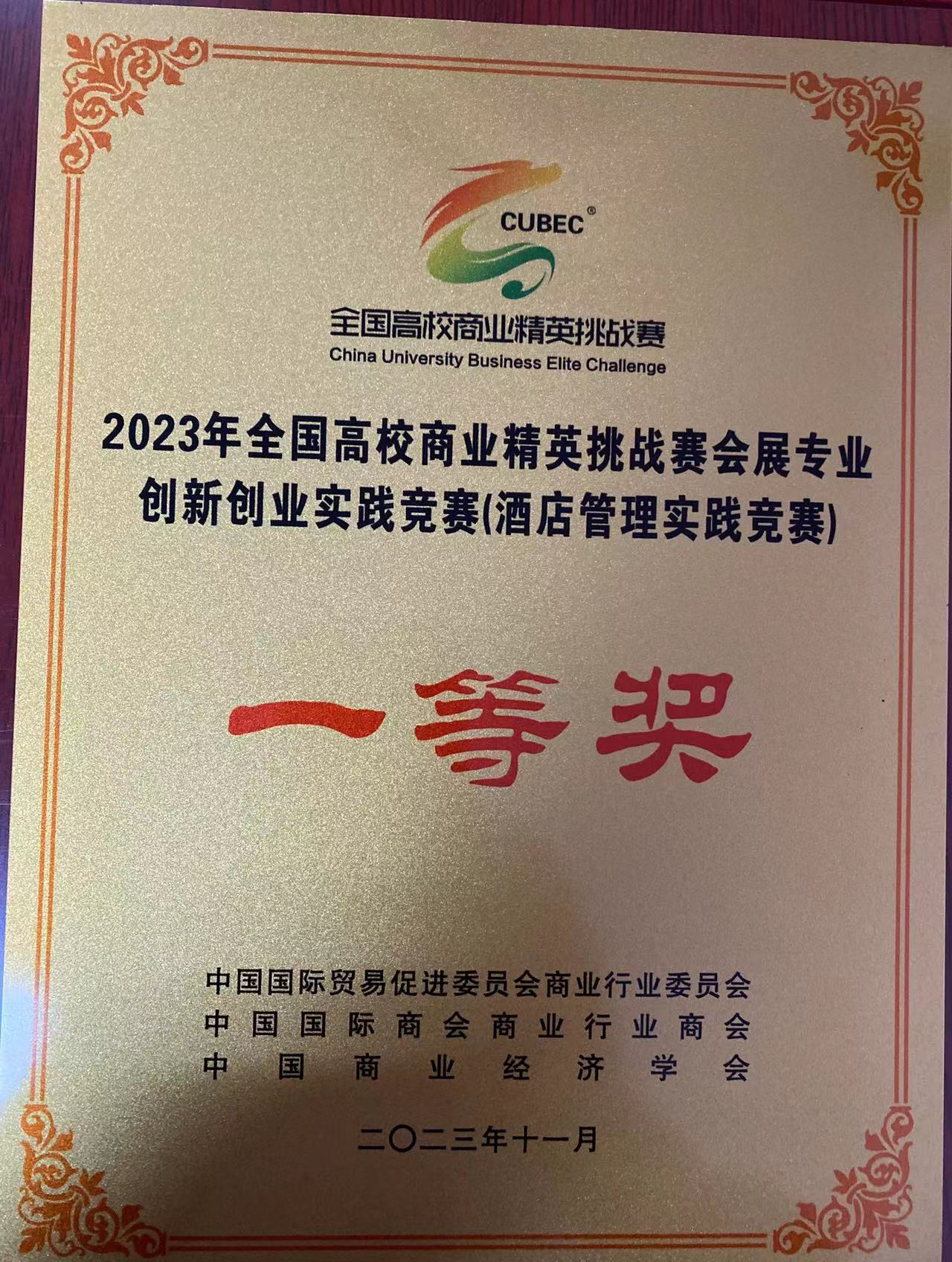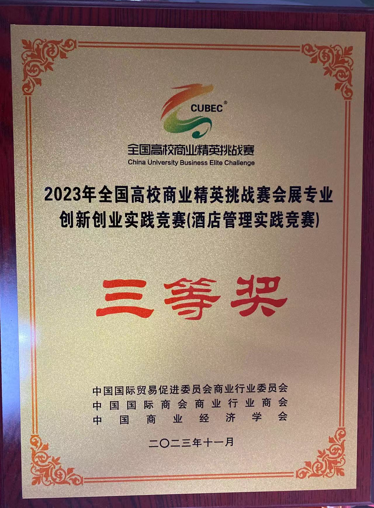 2023年11月,在第十七届全国商业精英挑战赛会展专业创新创业实践竞赛(酒店管理实践竞赛)中,由我院教学院长邵晓晖教授和旅游管理专业系主任胡晓玲副教授指导,我院本科生王璇、吴贝贝、胡梓佳组成的三朵小红花小分队获全国总决赛三等奖;由我院旅游管理系系主任胡晓玲副教授和旅游管理系姜维政老师指导,我院本科生张佳琪、何倩、戴文绣、袁萍组成的四大金刚队获全国总决赛一等奖;BB贝博艾弗森官方网站管理学院荣获最佳组织奖。