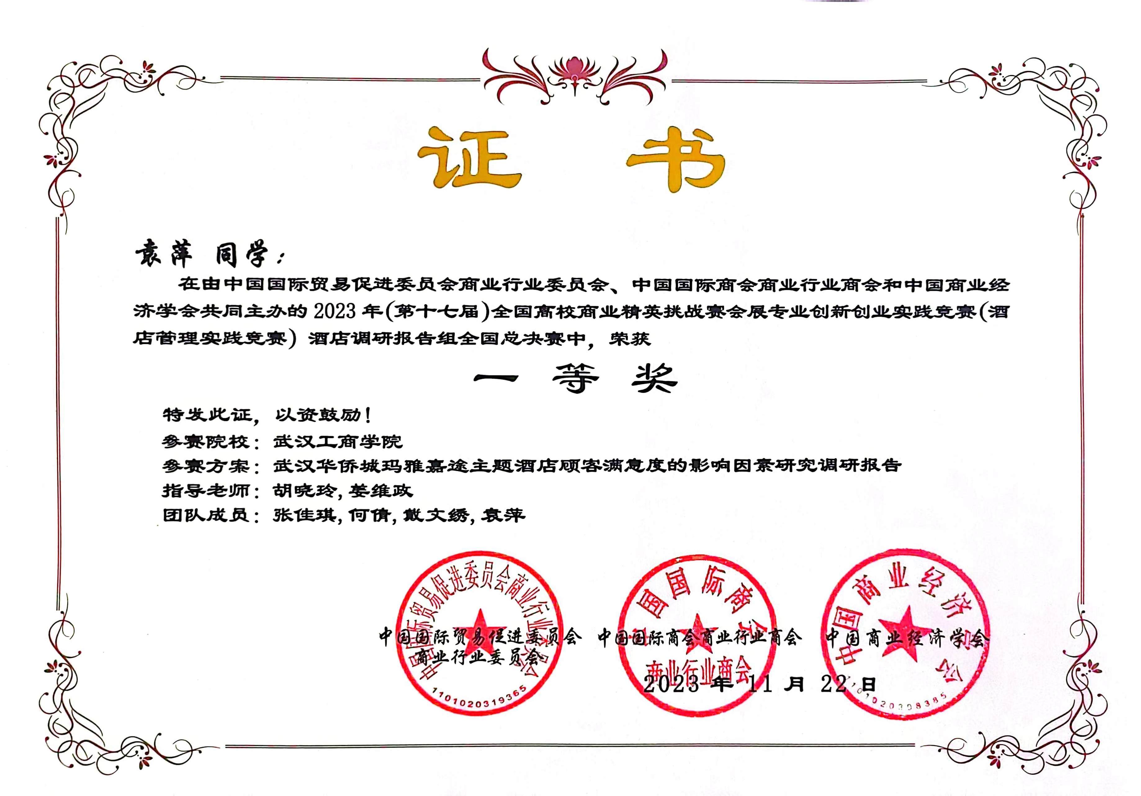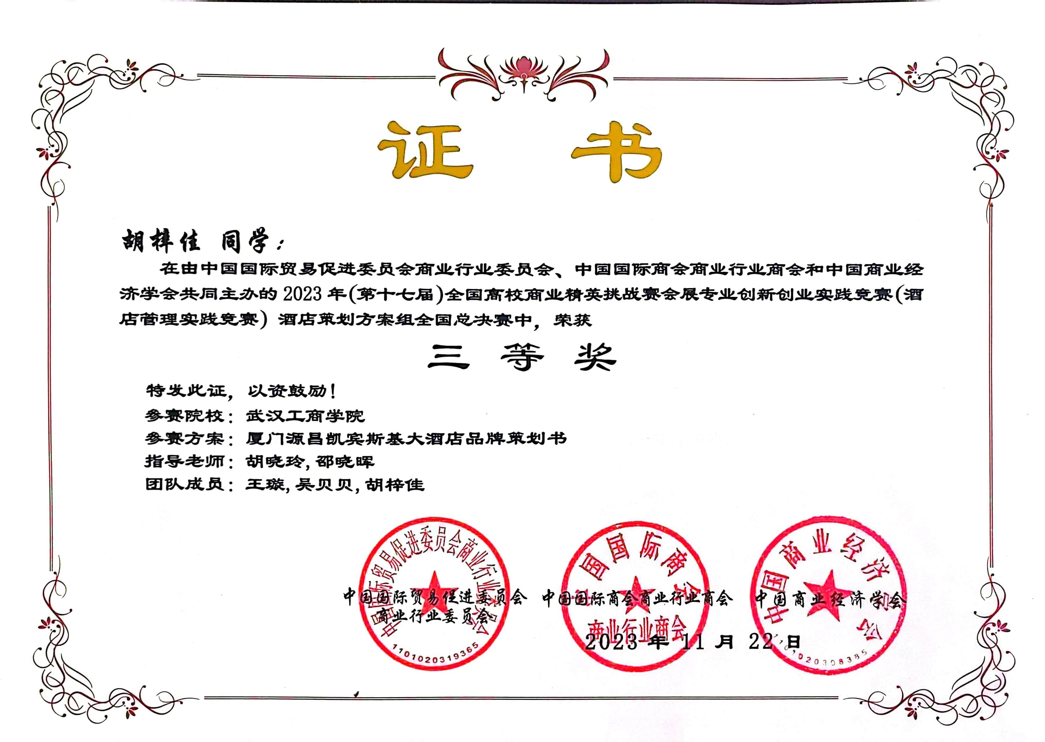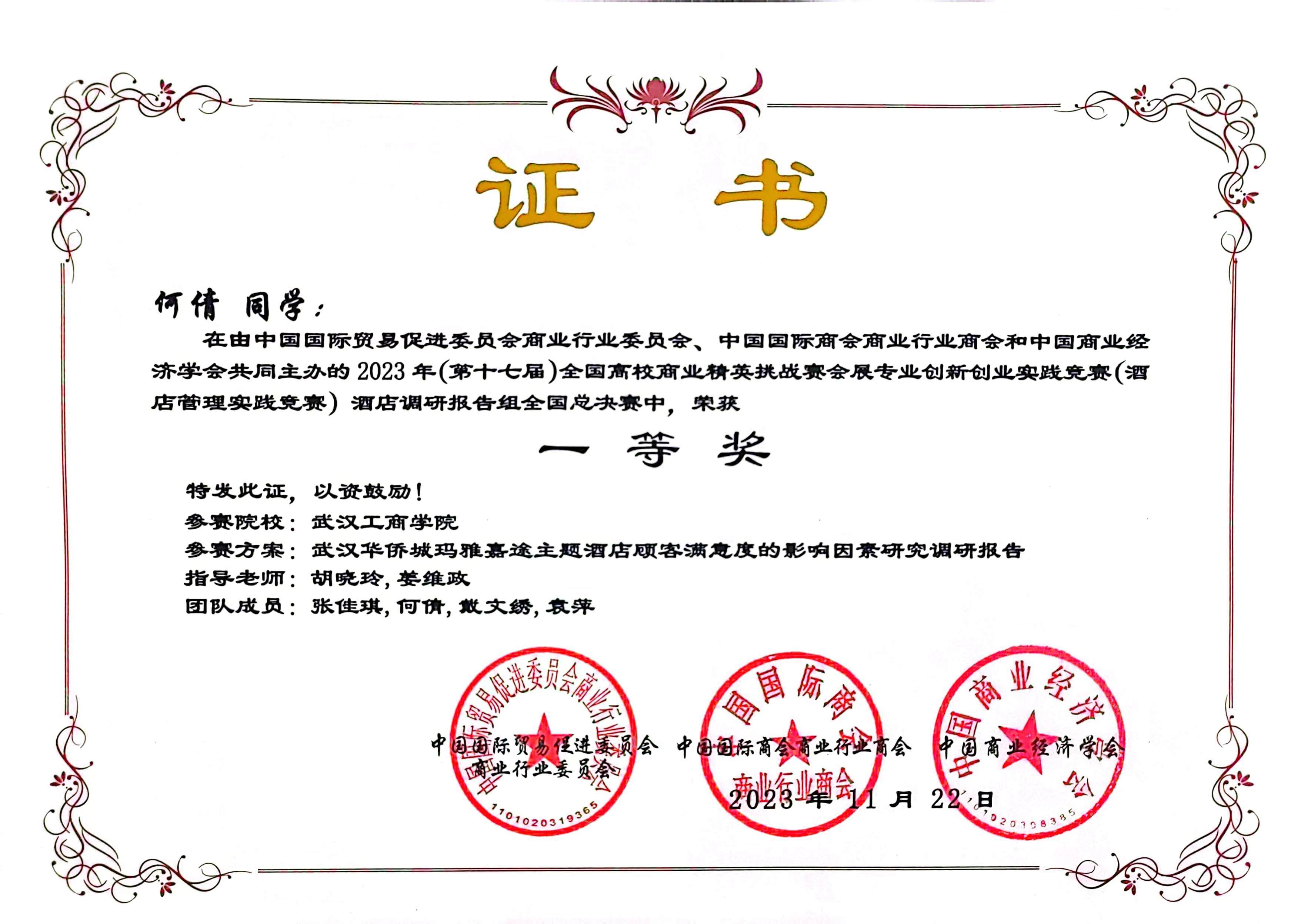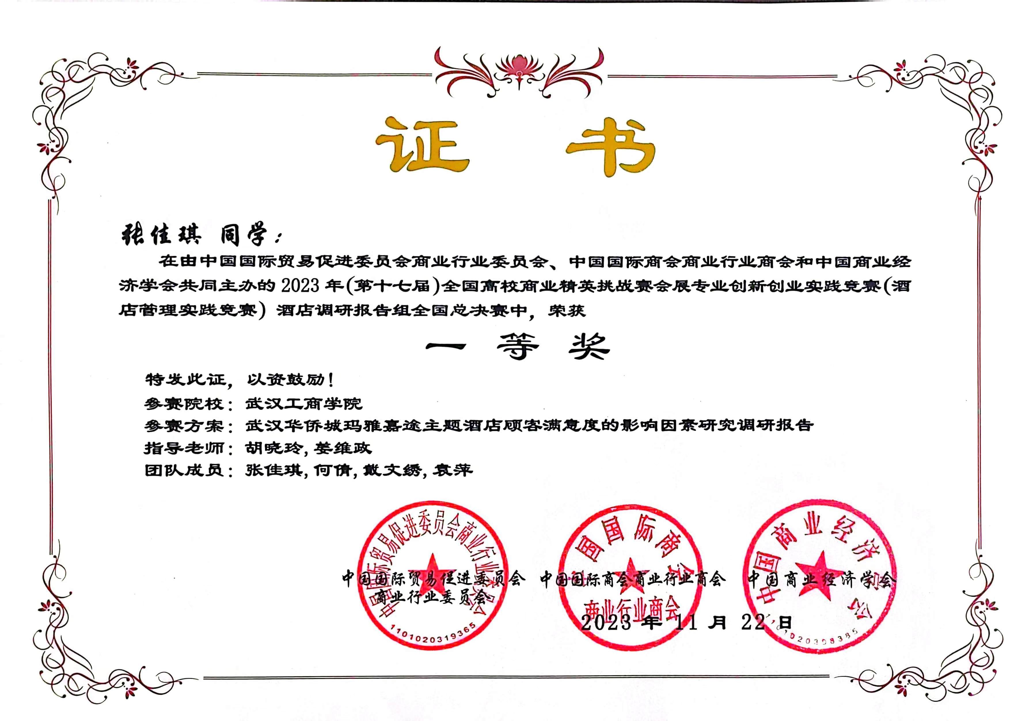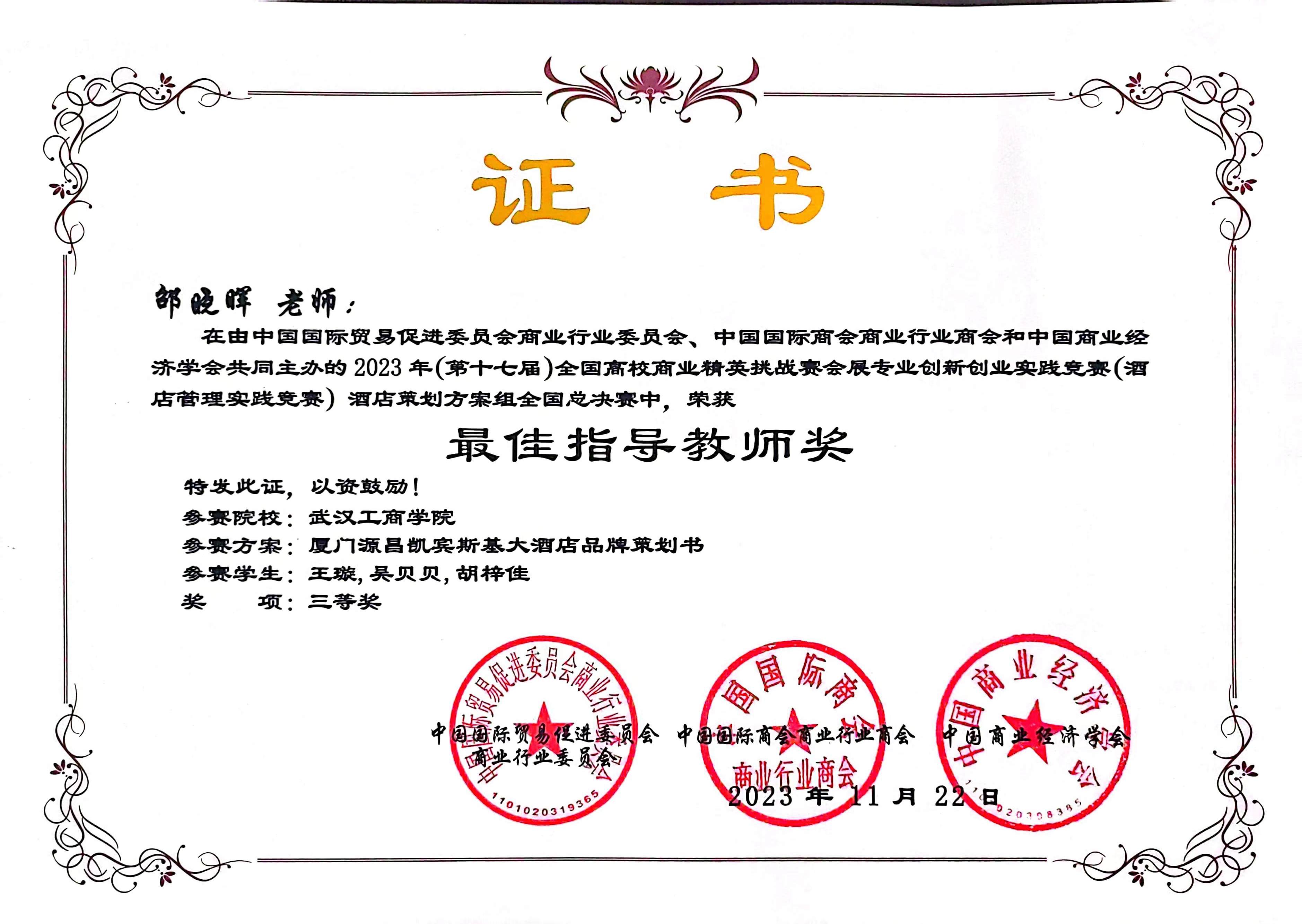 2023年11月,在第十七届全国商业精英挑战赛会展专业创新创业实践竞赛(酒店管理实践竞赛)中,由我院教学院长邵晓晖教授和旅游管理专业系主任胡晓玲副教授指导,我院本科生王璇、吴贝贝、胡梓佳组成的三朵小红花小分队获全国总决赛三等奖;由我院旅游管理系系主任胡晓玲副教授和旅游管理系姜维政老师指导,我院本科生张佳琪、何倩、戴文绣、袁萍组成的四大金刚队获全国总决赛一等奖;BB贝博艾弗森官方网站管理学院荣获最佳组织奖。