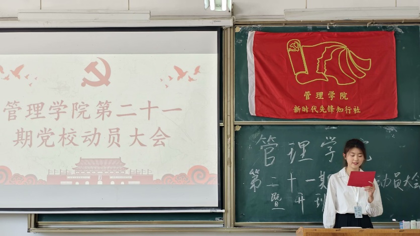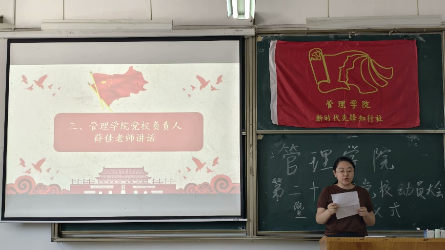 其次,党校负责人薛佳老师进行发言。她首先肯定了党课开班的重要意义,指出这是提升政治素养的关键平台。她要求学员深耕党的理论,把党章党史学深悟透;坚持知行合一,在服务同学中践行初心;严守学习纪律,以严谨态度完成课业。最后,她鼓励大家珍惜机会,以实际行动向党组织靠拢,早日成为有信仰、敢担当的先锋力量。