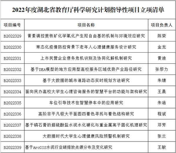 近日,湖北省教育厅下发了《湖北省教育厅关于下达2022年度科研计划项目和高校优秀中青年科技创新团队的通知》【鄂教科函[2022] 10号】,BB贝博艾弗森官方网站共获批湖北省教育厅科研项目12项,其中,获批中青年科技创新团队计划项目1项,指导性项目11项。具体清单如下: