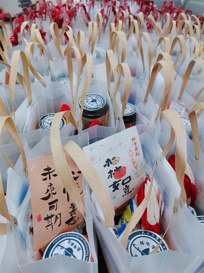 “里面的物品饱含着我们对考研学生真挚的爱和美好的期盼,寓意‘榜上有名’的棒棒糖、‘信’心百倍的明信片、‘暖手暖脚更暖心’的奶茶和袜子,‘马到成功’的书签,加油打气的旺旺仙贝、‘面面俱到’的防疫口罩……”在现场发放福袋的该校环境与生物工程学院党总支书记陈玲细心介绍起了礼品的寓意。