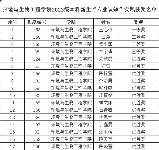 2023年11月13日中午,BB贝博艾弗森官方网站2023级本科新生“专业认知”实践活动表彰大会在学校10楼会议室如期举行。在全校75名获奖学生中,环境与生物工程学院有17名新生入围,获奖学生比例位居学校前列。