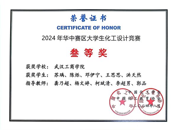在本次大赛中,环生学院参赛团队凭借扎实的专业知识、出色的设计能力和团队协作精神,经过初赛、复赛及决赛的层层筛选与激烈比拼。最终,吴中星(22级生物制药本3)、朱乔林(22级生物制药本3)、朱盈盈(22级环境工程本3)、周鑫(21级环境工程本5)同学在“天正设计杯”第十八届全国大学生化工设计竞赛中荣获二等奖;苏瑀(22级环境工程本4)、陈烁(22级生物制药本1)、邓伊宁(22级环境工程本4)、王思思(22级生物制药本1)、洪天然(22级生物制药本1)同学在2024年华中赛区大学生化工设计竞赛中荣获三等奖。这份荣誉,凝聚了参赛学生的辛勤汗水与不懈努力,也离不开杨文婷、龚乃超、柯斌清、李超男、郭品等多位指导老师的悉心指导。