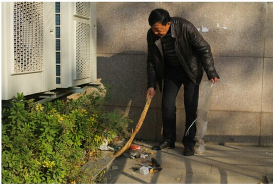 物业部部长黄浩认真清除垃圾(左一)