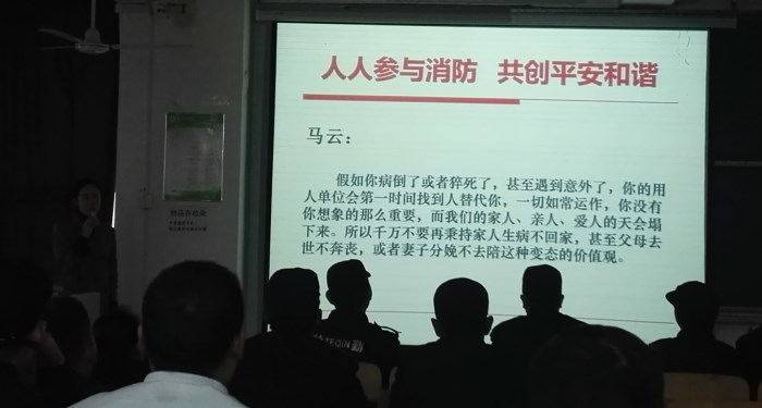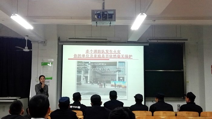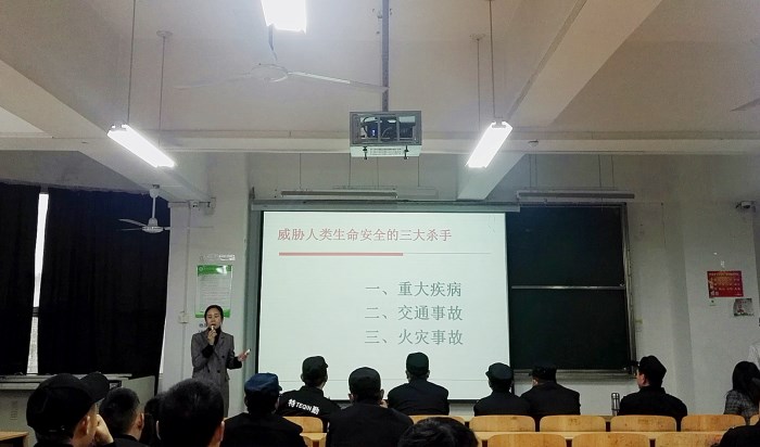 讲座以人类健康的三大杀手为引题展开,全面而详细的讲述了火灾逃生知识,如高楼起火逃生应遵循能向下就不往上,走楼梯代替电梯,人多不便下行就退回来找开阔大窗的房间或阳台藏身,既便于防烟又利于救援等。