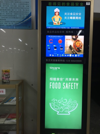 针对校内餐饮加工和售卖区域,经营部联合食药局单位,在各个就餐区域投放新型的明厨亮灶设备,该种设备除了具备传统的摄像监控功能外,更具有食堂证照查询,卫生评级等功能,就餐者能够直接通过设备查询食堂的基本卫生状况。