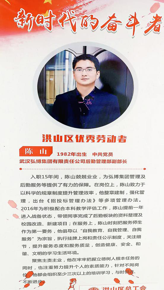 【后勤管理部4月30日讯 编辑周丹】4月30日,艳阳高照,五一放假前的最后一个工作日,从洪山区政府传来喜讯,后勤管理部陈山部长荣获洪山区优秀开劳动者称号,成为洪山区新时代的奋斗者的杰出代表!