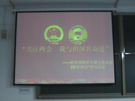 2012年3月15日晚,武汉长江工商学院经济与商务外语学院学生第七党支部开展了“关注两会  我与祖国共奋进”的2012“两会”学习活动。