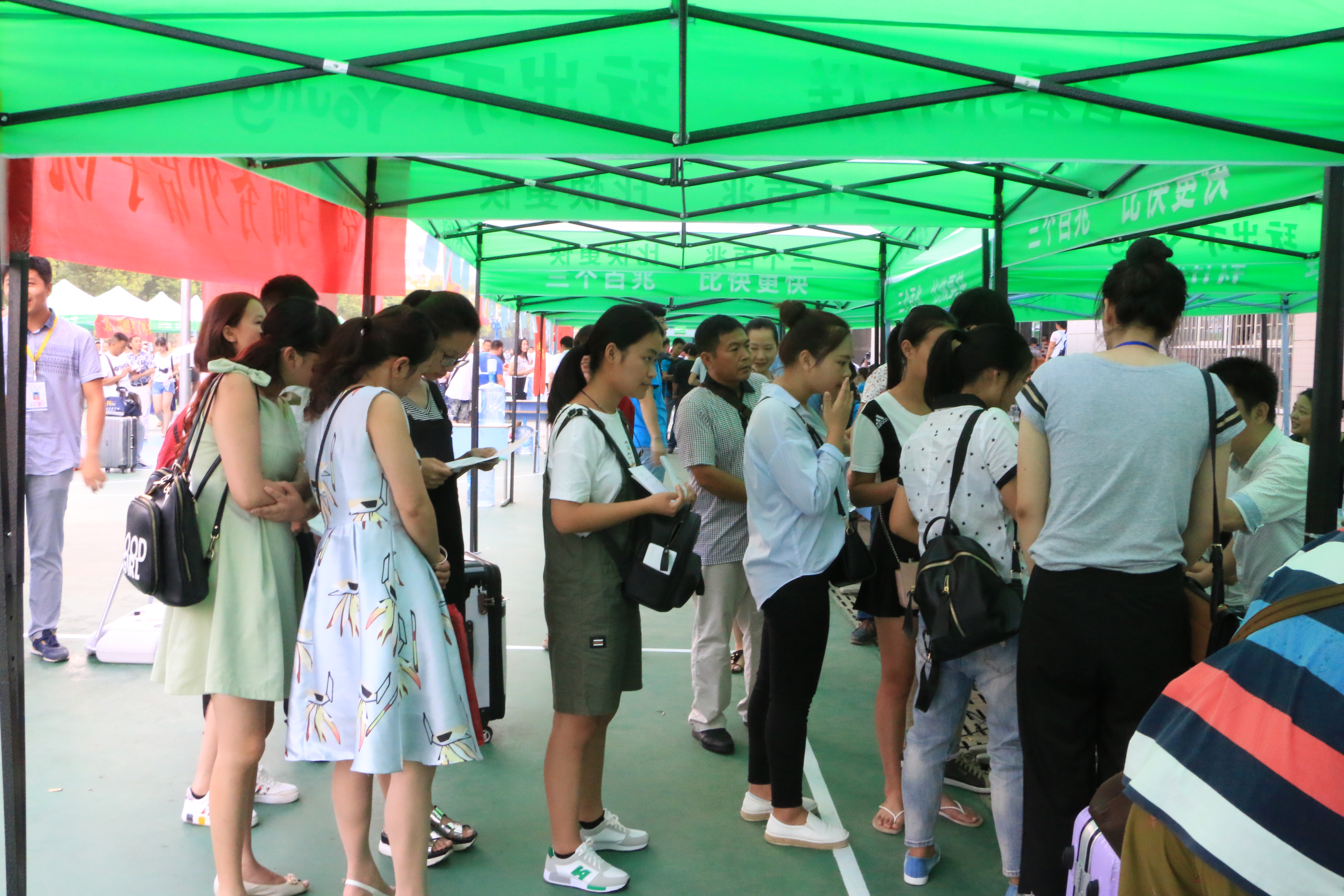 图为家长与新生学子在报道现场