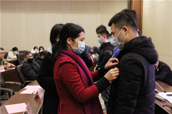 图为彭秀春董事长赠与校徽 摄影:冯哲昊