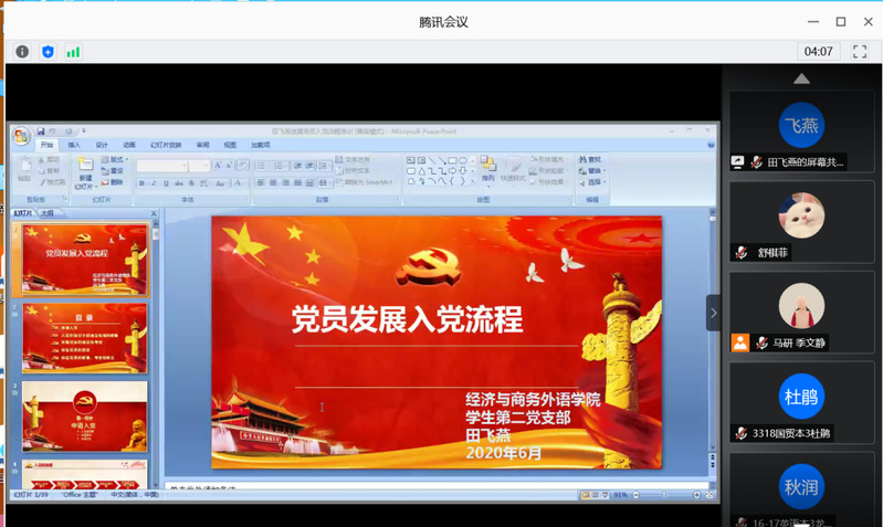 2020年6月14日晚上19:00,BB贝博艾弗森官方网站经济与商务外语学院第九期党校党课第七讲如期举行。经济与商务外语学院青年马克思主义研究协会邀请了党校带队老师田飞燕老师。田飞燕老师以“党员发展入党流程”为主题,给大家带来精彩的一课。