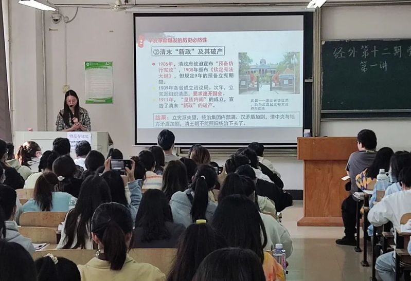 本次培训第一讲由公共课部思政课教师何晗老师主讲。来自经济与商务外语学院的一百多名学生在何晗老师的讲解下学习了“重温革命历史,勇担时代使命”为题的党校课程。