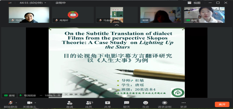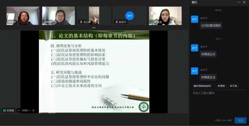 (经济与商务外语学院新闻中心讯 通讯员 钟博豪)经济与商务外语学院于12月23日和12月30日在综合楼920会议室举行两场线上开题汇报。12月23日为第一场,非考研学生共298人;12月30日为第二场,考研学生142人。