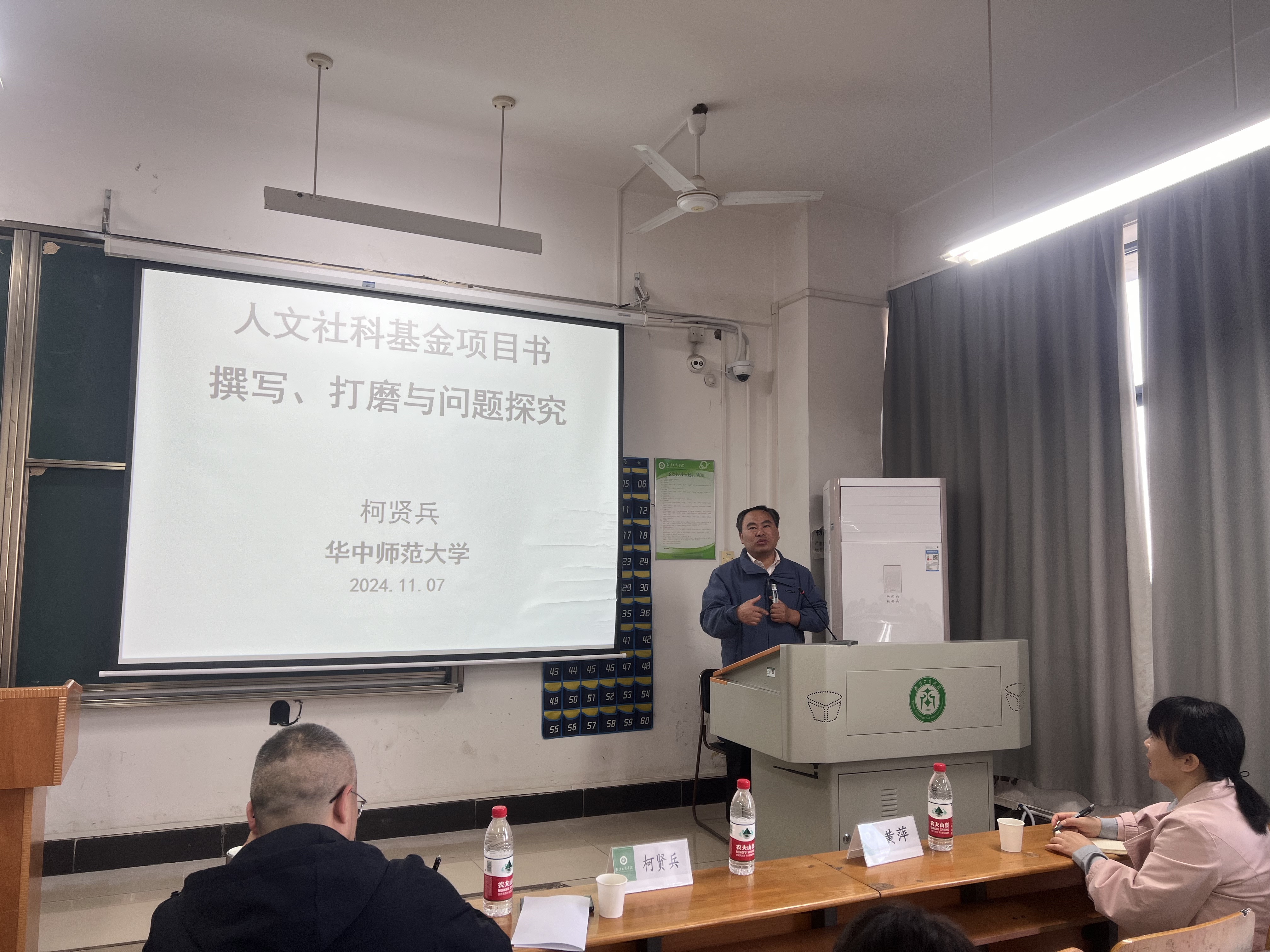 经济与商务外语学院新闻中心讯 (记者:郭欢、潘起予)2024年11月7日下午15:30在综合楼611教室,《人文社科基金项目书撰写、打磨与问题探究》专题讲座在我校经济与商务外语学院成功举办,此次讲座特别邀请到了华中师范大学外国语学院教授、博士生导师柯贤兵作为主讲嘉宾,经济与商务外语学院副院长徐良培副教授主持讲座,公共外语系主任黄萍副教授组织。