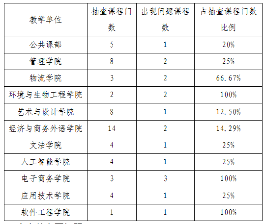 各教学单位: 根据《关于开展2019-2020学年课程考核情况检(抽)查的通知》要求,教务部于10月23日上午组织校级教学专项检查组对各学院(部)2019-2020学年第二学期的期末考核材料进行了随机抽查,现将检查情况通报如下: 一、基本情况 (一)各教学单位自查情况 各教学单位在规定的时间内,组织系(教研室)主任及骨干教师自查了所属试卷,共涉及考试课程224门,考查课383门,考核方式改革课程3门。对于自查中发现的问题,各教学单位已提出相应的整改措施并着手整改。 (二)学校抽查情况 教务部根据各教学单位提供的本单位期末考试课程目录(含归档号)和总结报告,随机抽查了56门(见下表,约占5%)课程考试试卷及考查课材料。检查内容涵盖试题命题、试卷批阅、试卷分析、试卷装订、平时成绩记录、考查课材料归档情况等。本次抽查整体情况较好,大部分试卷批阅和审批程序完整,评分比较公正,材料归档规范,常规管理基本落实到位。