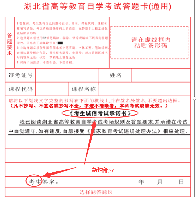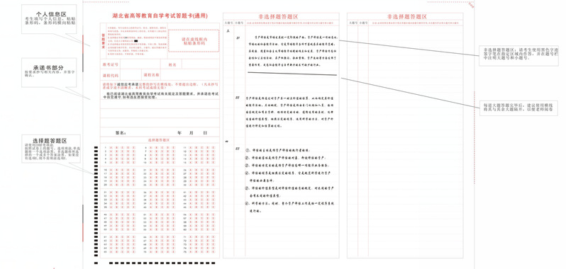 6、考生应主动配合课程笔迹信息采集,在答题卡指定区域按规定完整抄写《考生诚信考试承诺书》,不抄写、不签名或抄写不全,字迹不清晰者,该科考试成绩无效。毕业时省教育考试院将对每张答题卡上的《考生诚信考试承诺书》笔迹进行复核,凡笔迹不一致,经鉴定为代考的,将根据《国家教育考试违规处理办法》作出成绩作废、延迟毕业、记入国家教育考试诚信档案等处理。