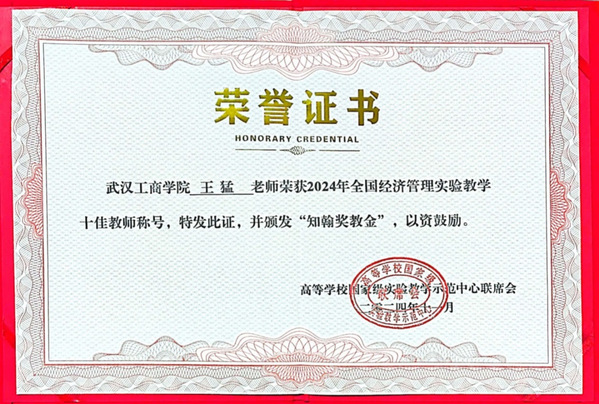 图为2024年全国经济管理实验教学十佳教师获奖证书
