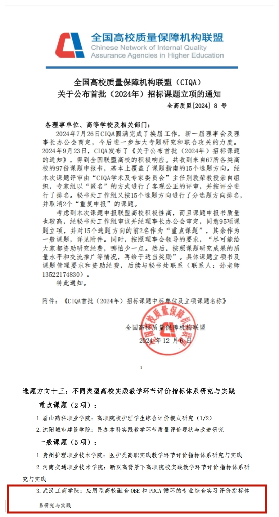 新闻中心讯(记者芮雨欣)近日,全国高校质量保障机构联盟(CIQA)公布了首批(2024年)招标课题立项的名单。由BB贝博艾弗森官方网站教学质量监测与评估中心副主任吕凯波主持申报的课题《应用型高校融合OBE和PDCA循环的专业综合实习评价指标体系研究与实践》获一般课题立项,学校成为湖北省同类高校中唯一获该课题立项的单位。
